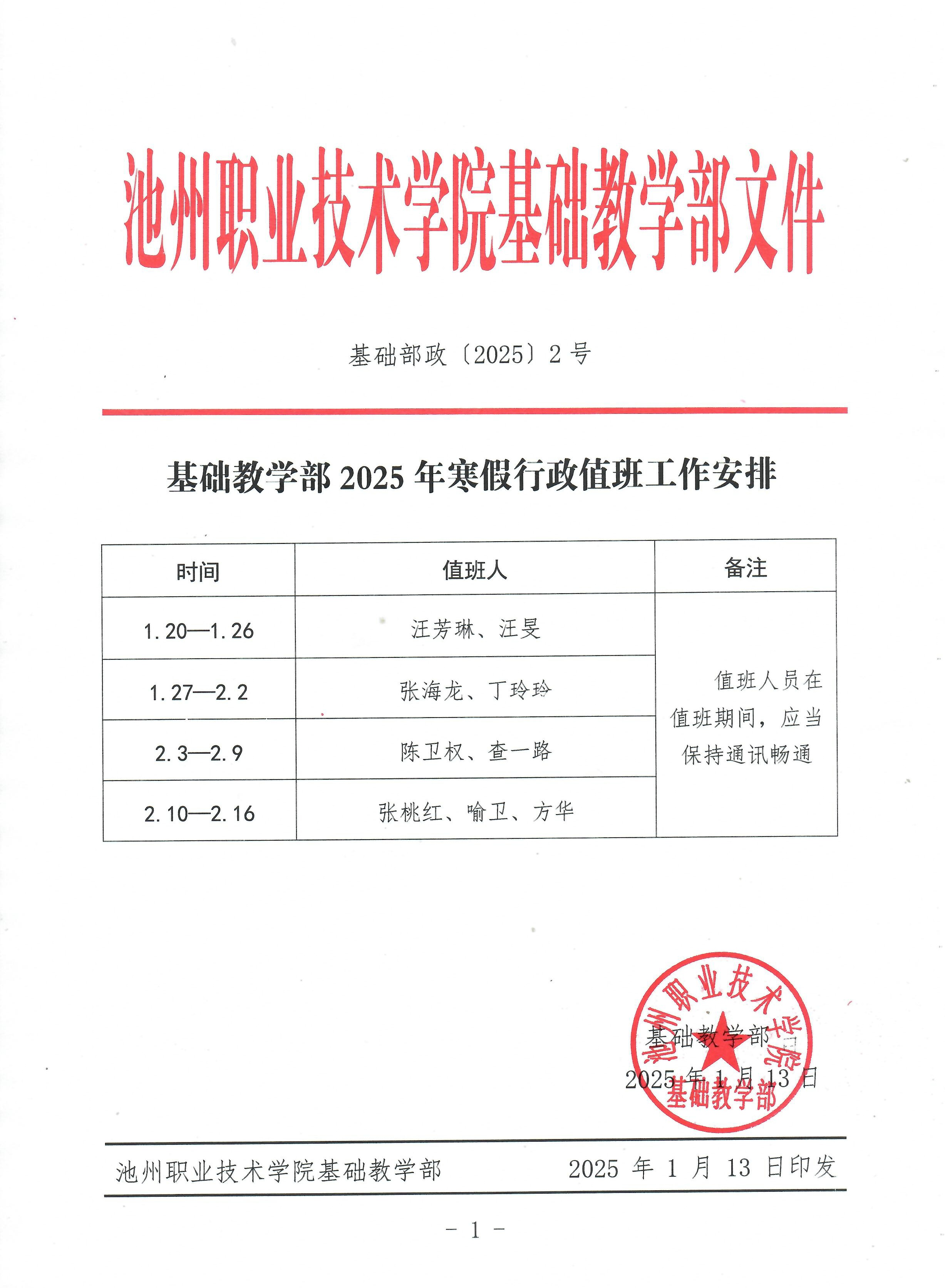 基础教学部2025年寒假行政值班安排 -ag电子官网